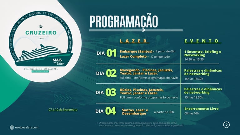 A Evolue Safety elevou o nível do mercado de SST com o mais forte ecossistema 100% focado nas necessidades e expectativas de Gestores, Líderes, Especialistas e Players do segmento de SST a bordo de um Cruzeiro Marítimo em dezembro de 2024.
